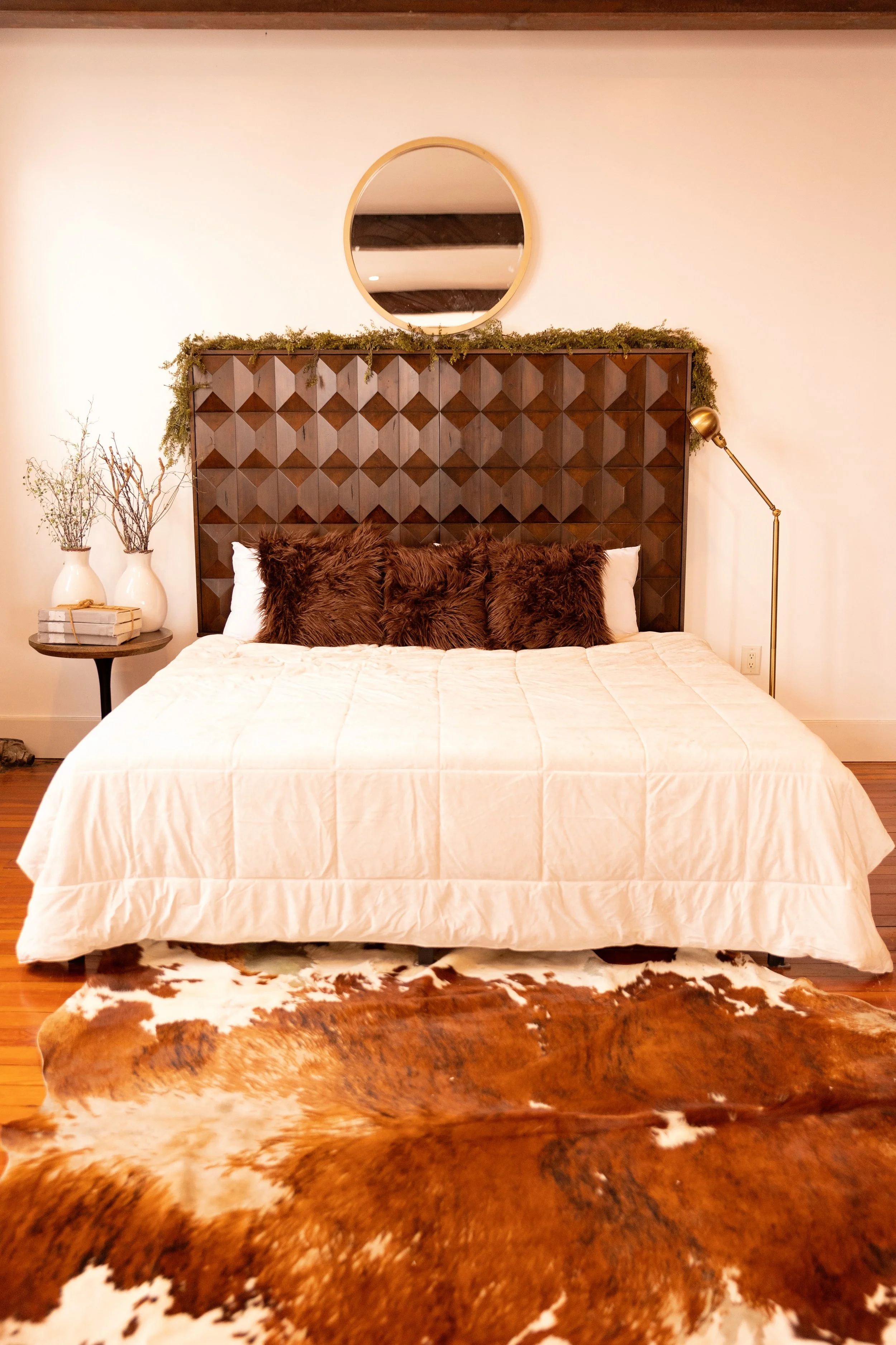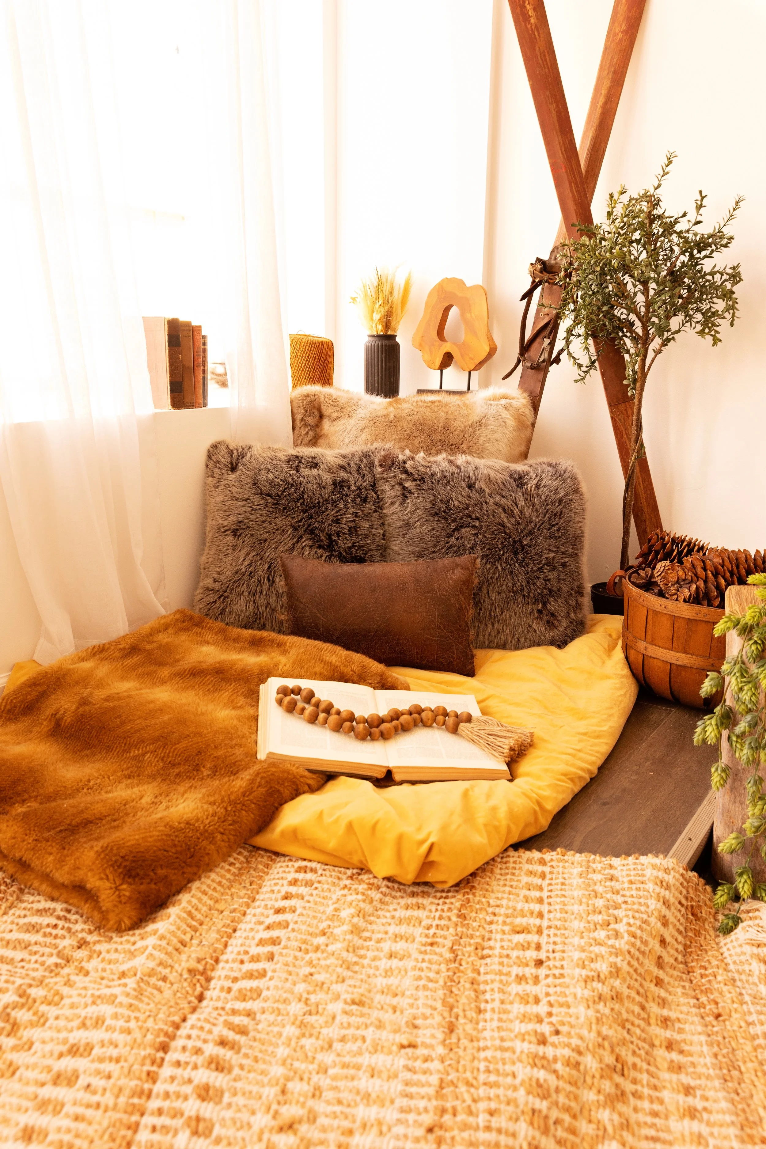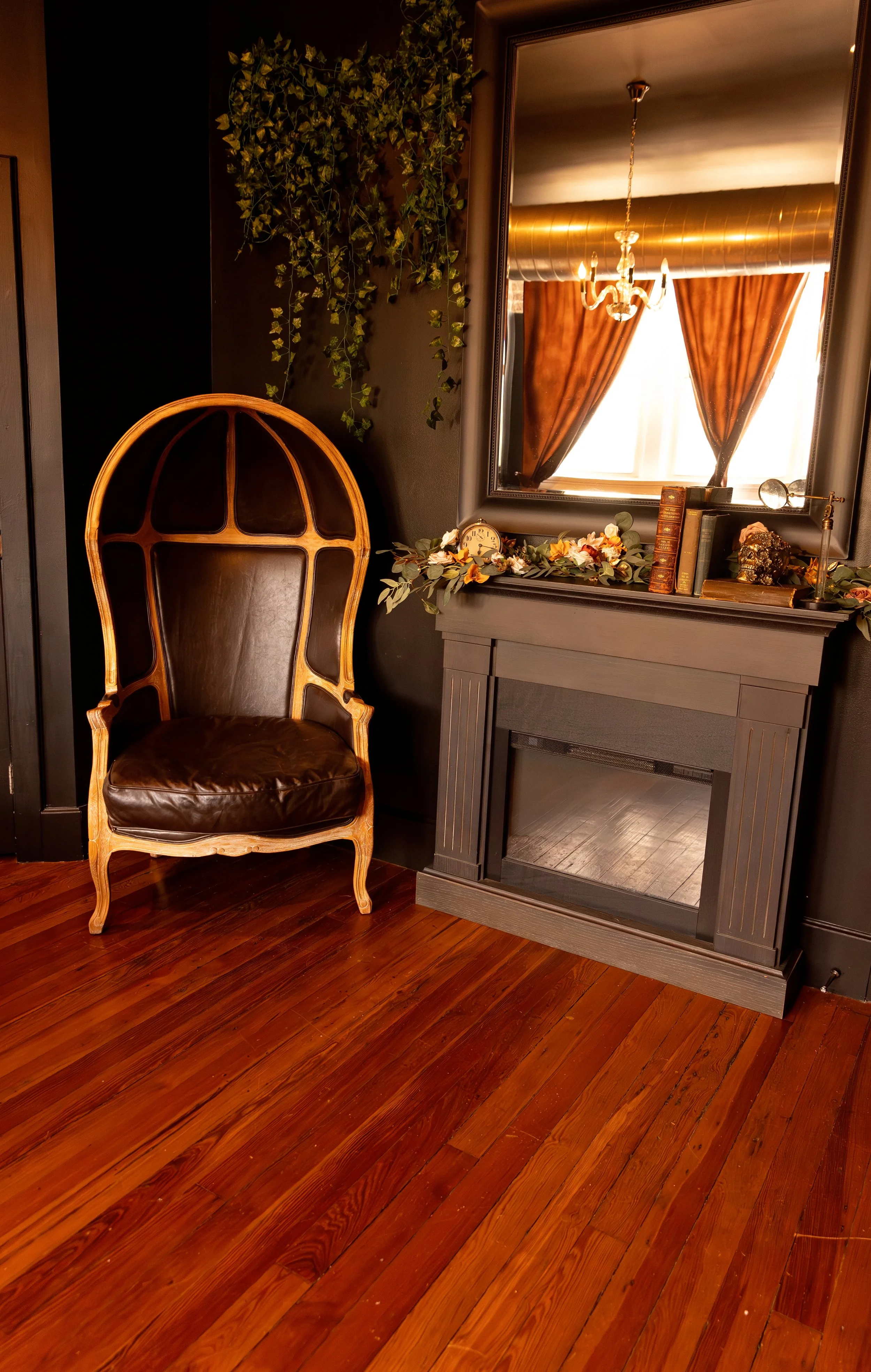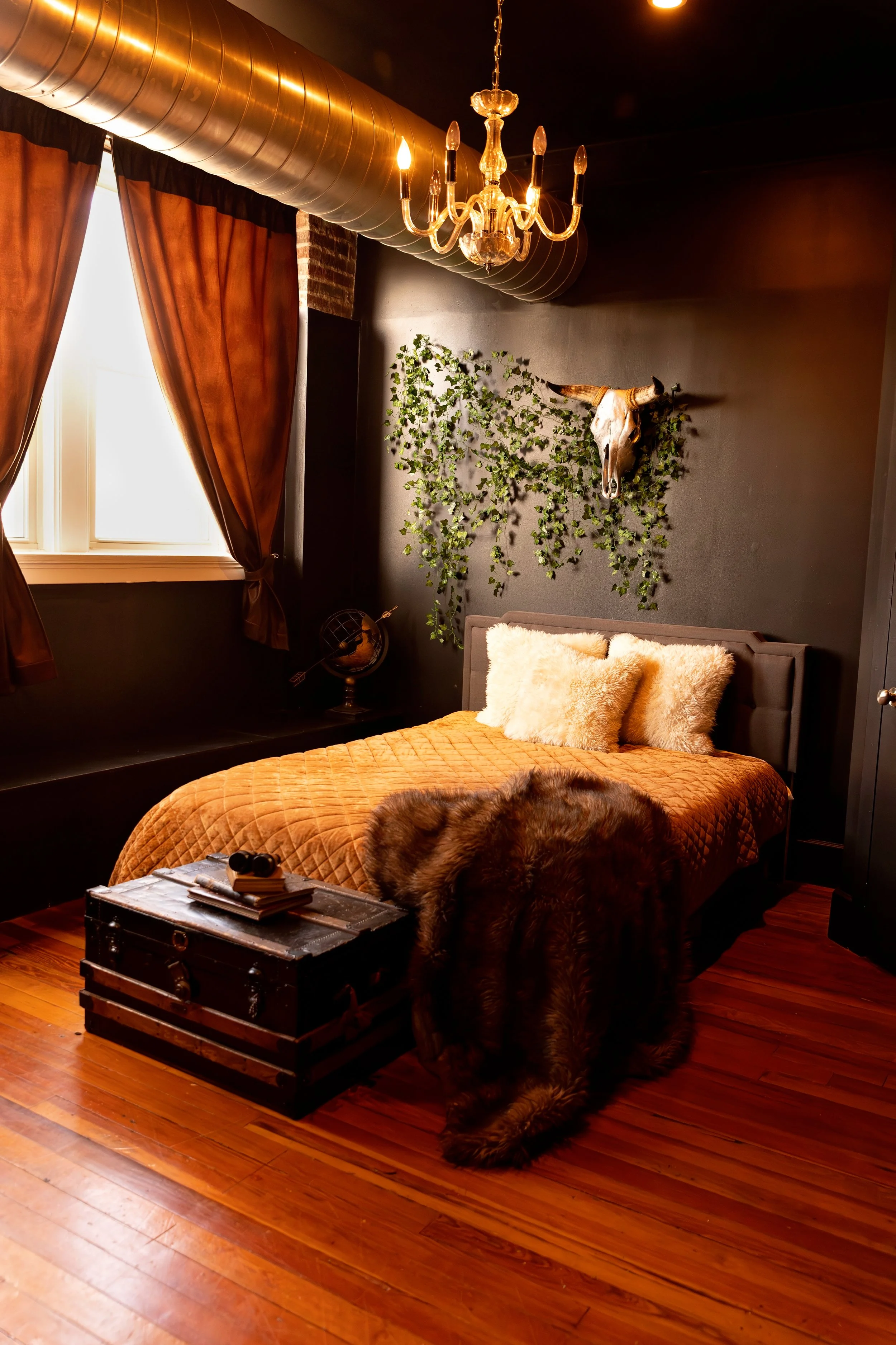 The Oxen Studio is the dark & moody room of your dreams. Currently decorated for gloomy spring. The walls, trim, and even ceiling are painted in an inky black that makes the subject really pop in the space. It is such a versatile studio, perfect for sensual boudoir shoots, or a fun family picture with everyone piled into the cozy bed.