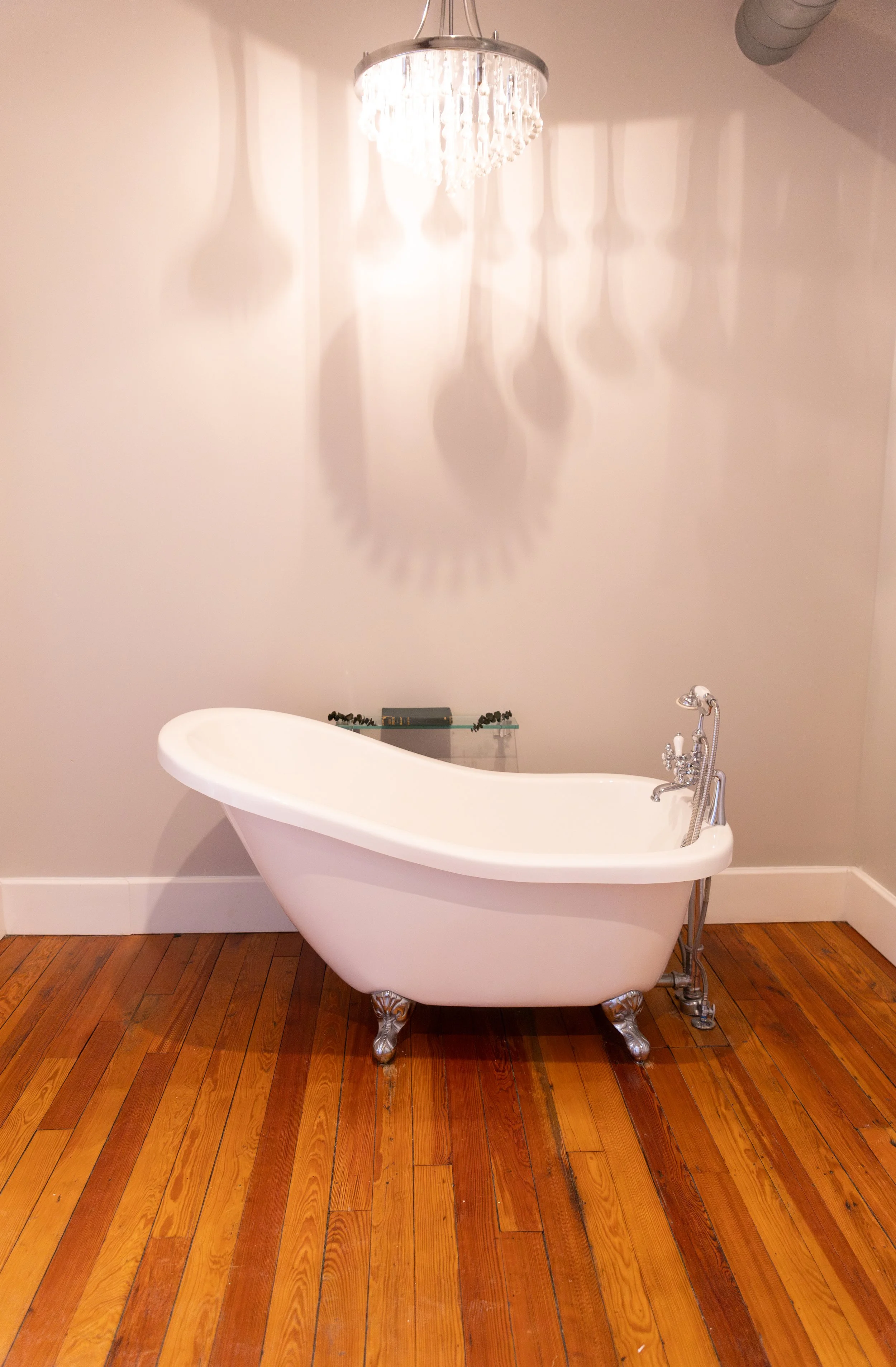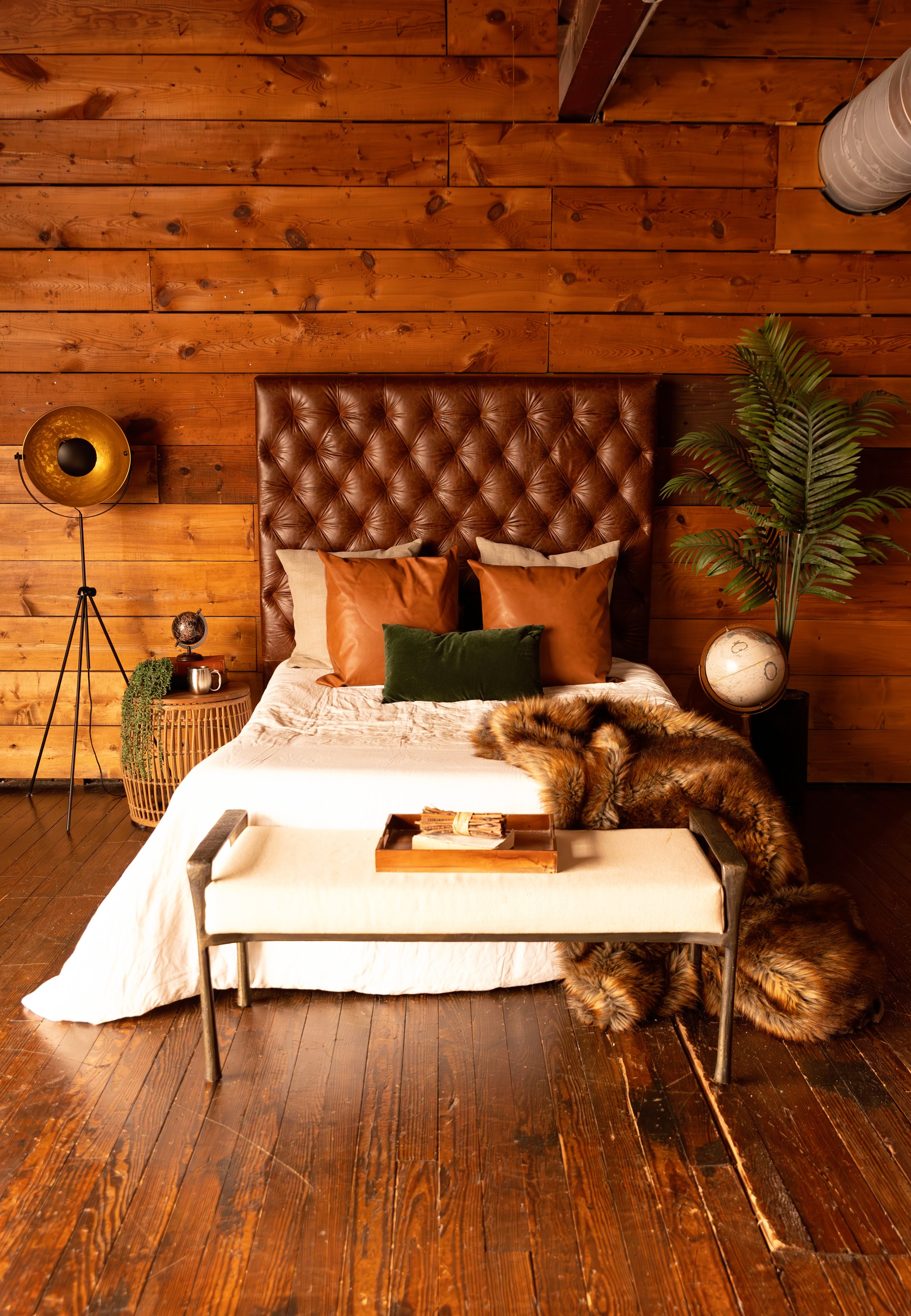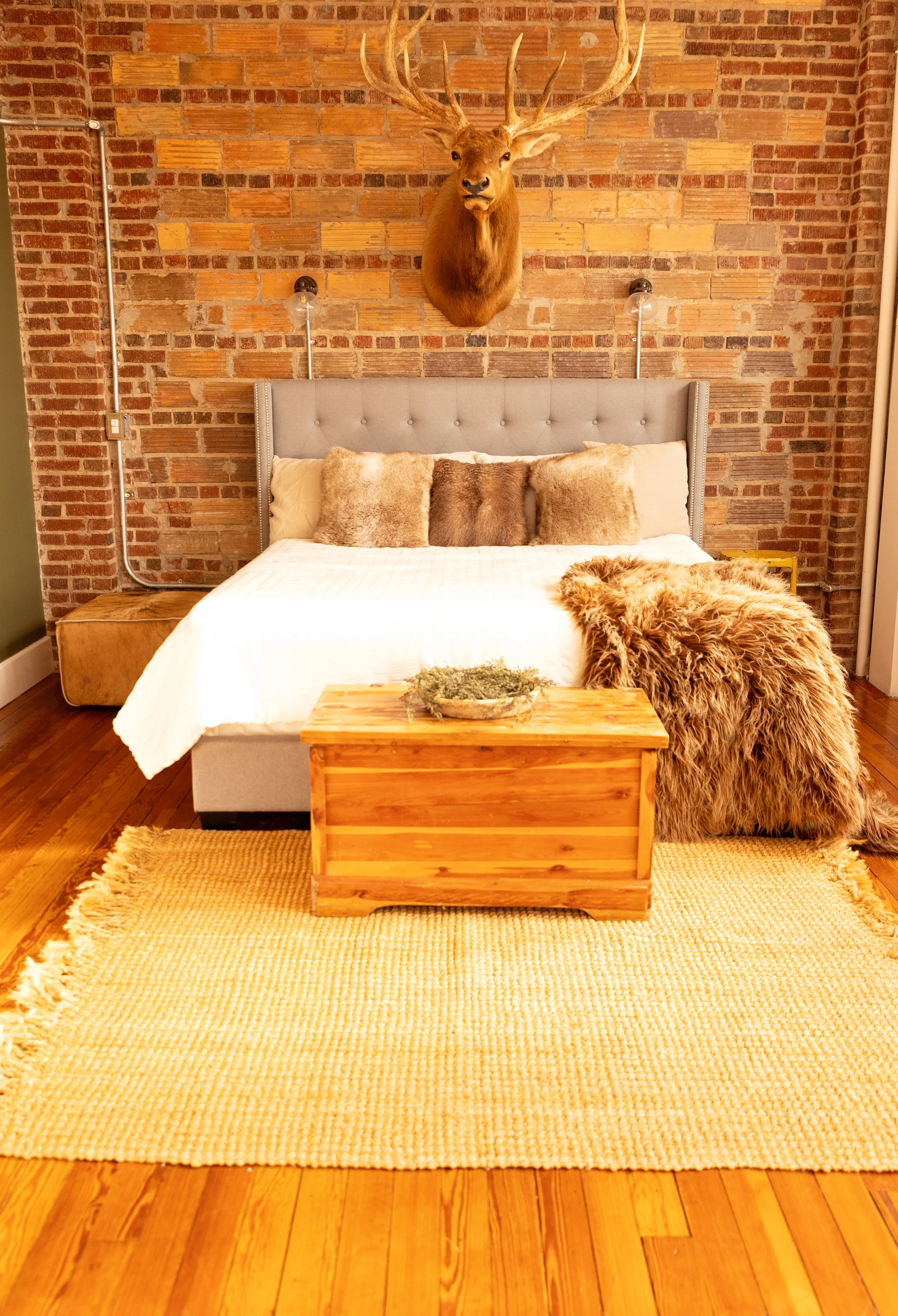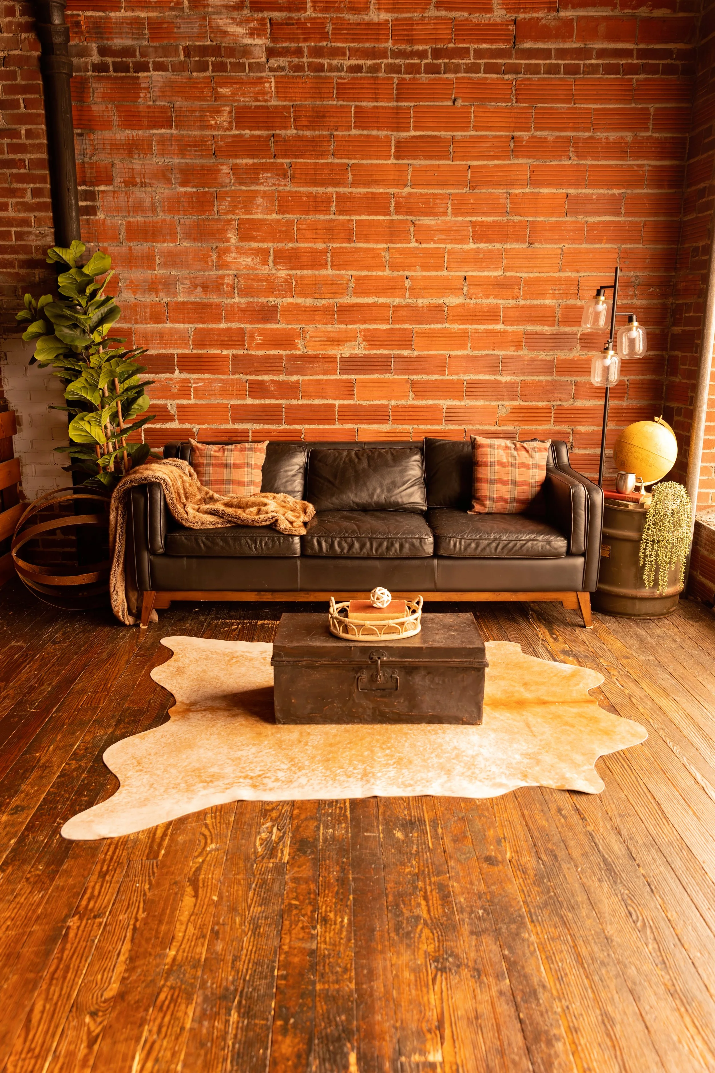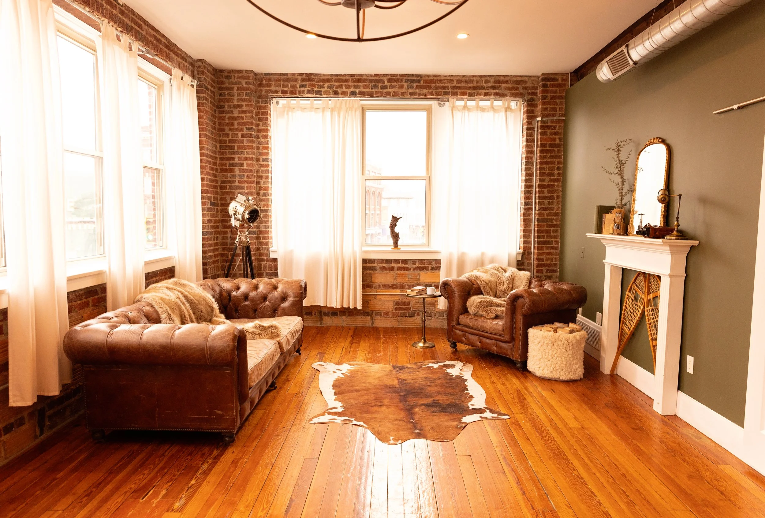 The Elk Studio might be our most iconic space to date. The huge Elk that hangs on the exposed brick wall over the bed makes for a perfect couples or boudoir shoot. The leather sofa lounge area provides a great space for family photos, and there is also a bathroom off the master suite. The bathroom provides a claw bathtub, glass shower, and a makeup room.